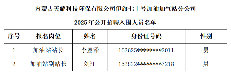 按照《内蒙古天耀科技环保有限公司伊旗七十号加油加气站分公司2025年公开招聘考试》相关要求,经发布公告、资格审核、笔试、面试、体检等环节,现将入围人员名单公示如下(排名不分先后)。